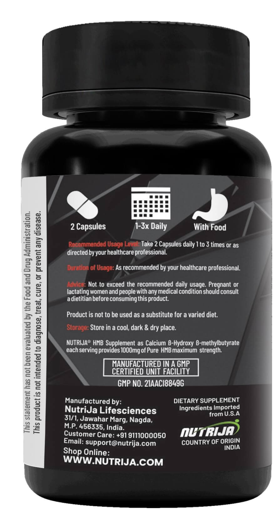 NUTRIJA® HMB (ß-Hydroxy ß-methylbutyrate) 1000MG Capsules is a completely vegan formula Ingredients sourced from USA